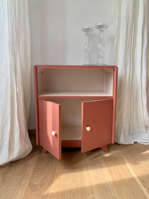 Il a été poncé, traité et repimpé à l’intérieur en vieux rose tout doux et l’extérieur en terracotta puis protégé avec un vernis mat incolore.