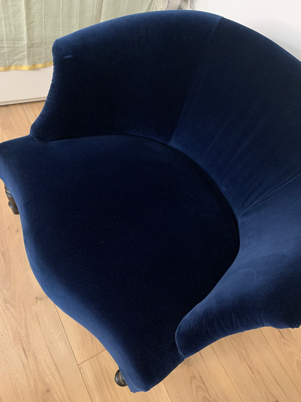Super fauteuil très confortable, entièrement dégarni, restauré, réparé. Il retrouve une nouvelle vie dans un beau velour bleu marine Manuel Canovas et une jolie toile de jouy ressortie du placard!